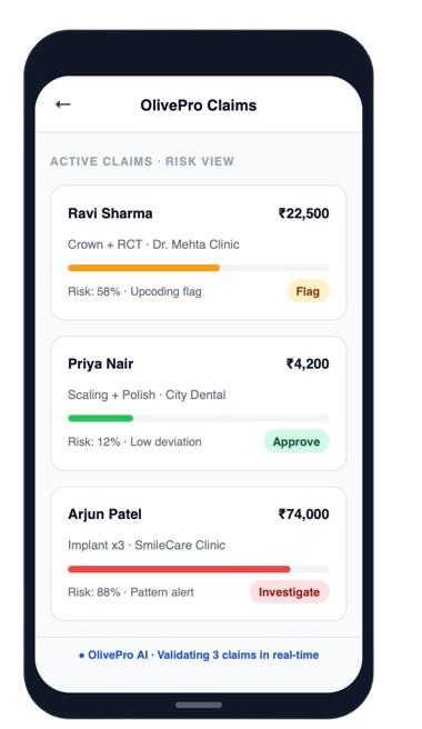 Olive Pro is an AI-powered Dental Claims Intelligence Platform that enables insurers to detect fraud, validate clinical accuracy, and automate adjudication—all in real time.